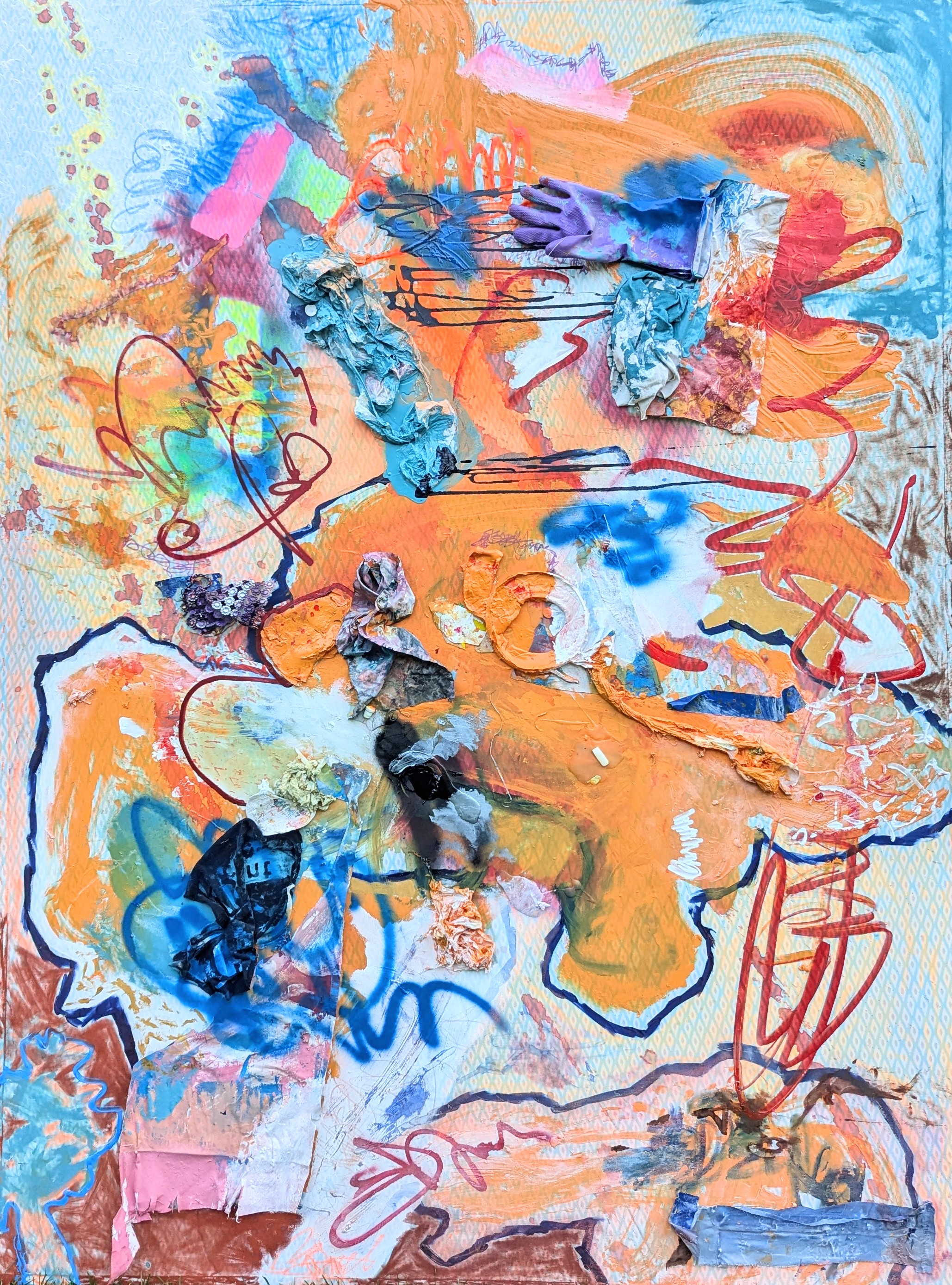 acrylic, latex, spray paint, pastel, ink, fabric scraps, latex glove