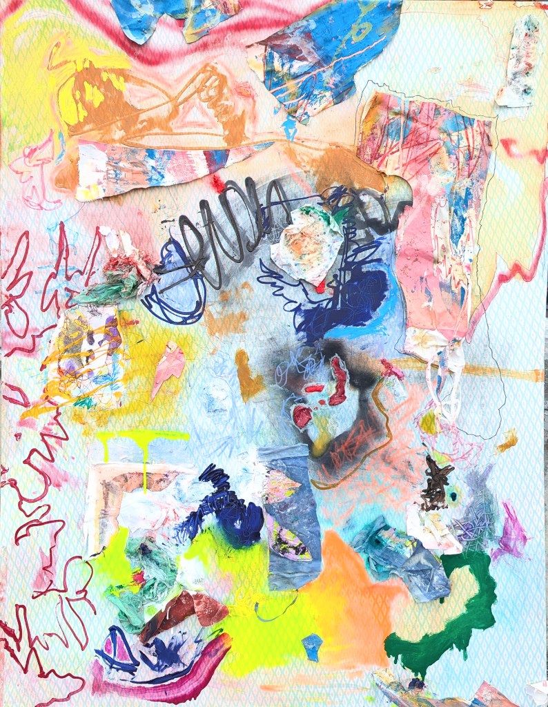 acrylic, latex, spray paint, pastel, ink, fabric scraps, plastic bag