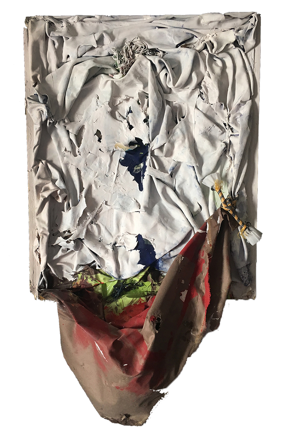“Still Picking at the Scab” 55″X30″ acrylic, latex paint, lacquer, yarn, fabric, industrial rope, found sign board