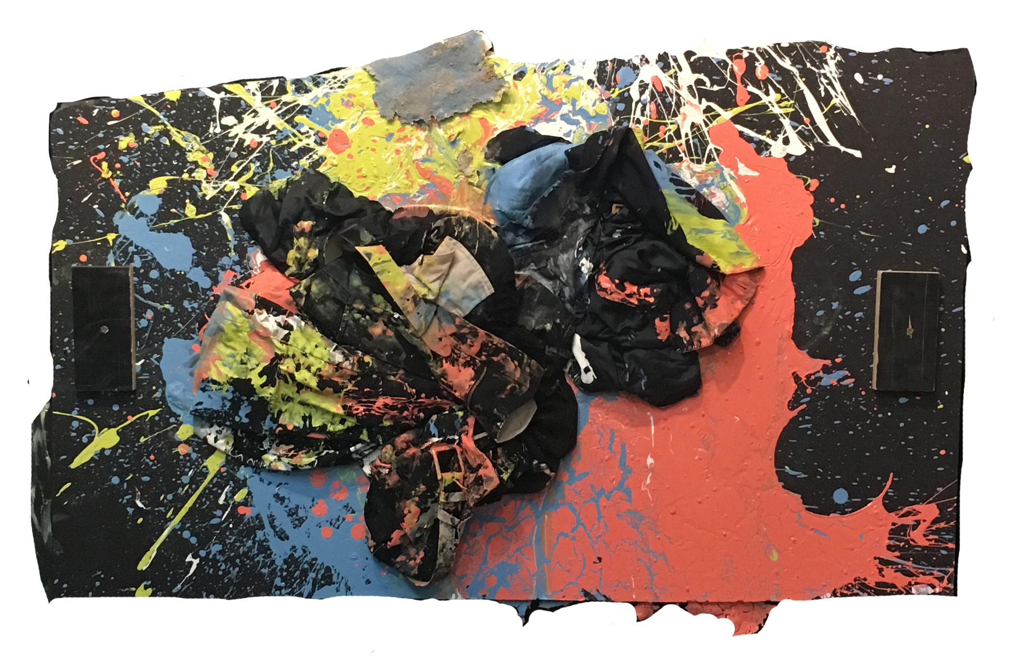 “The Farther the Distance the Dimmer the Memory” 30″X48″ latex paint, thread, suit jacket, dress pants, belt, sand, foam board, wood