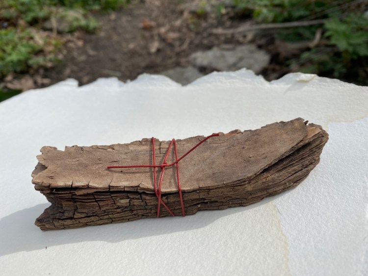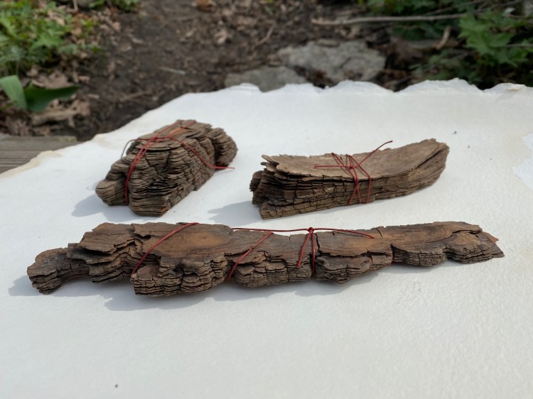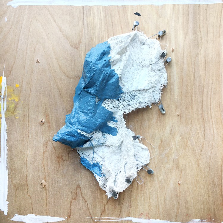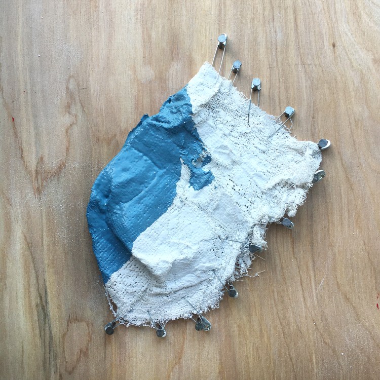 Kayla Cloonan, “An Act of Failed Preservation 1-4″, safety pinned plaster casts nailed to wood panel